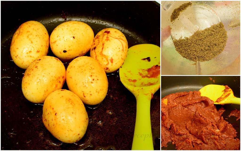 Make sure that you don't burn the masala. Sprinkle water if required while sautéing the masala. Add the potatoes and stir to coat them well with the masala. Add a cup of warm water and let it come to a boil. bring down the flame and let the potatoes cook. Once done, add the eggs, sugar and garam masala.